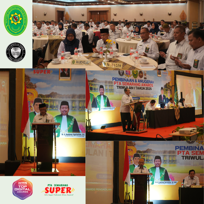 Bertempat di ruang Sumaryo Grand Ballroom The Sunan Hotel Solo, pada hari ini 21 April 2025, dan 22 April 2025 diselenggarakan kegiatan Pembinaan dan Penganugerahan Pengadilan Tinggi Agama Semarang Award Triwulan I Tahun 2025. Hadir dalam kegiatan tersebut Wakil Ketua PTA Semarang, Hakim Tinggi, Panitera, Sekretaris dan Pejabat Struktural dan Fungsional PTA Semarang serta Ketua, Panitera dan Sekretaris Pengadilan Agama se Jawa Tengah.